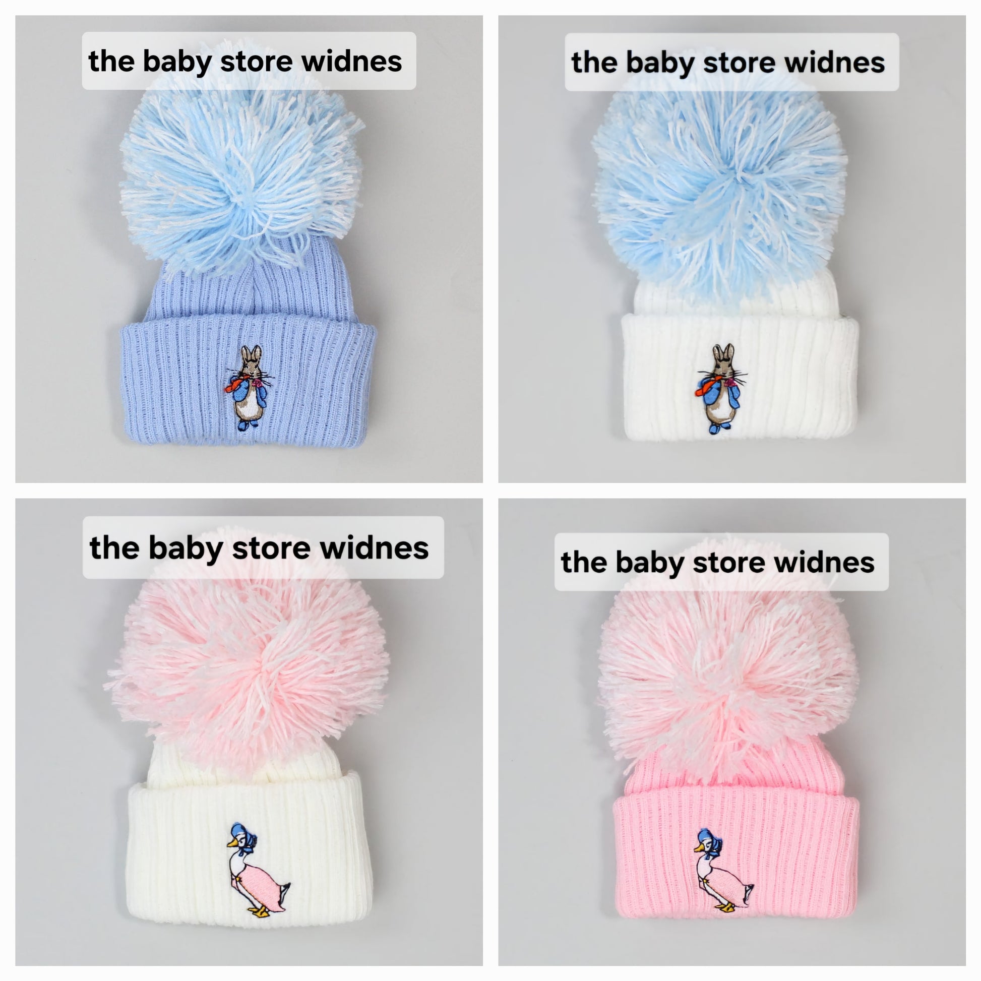 Baby Boys or girls embroidered pom hats with peter rabbit or jemima puddle duck